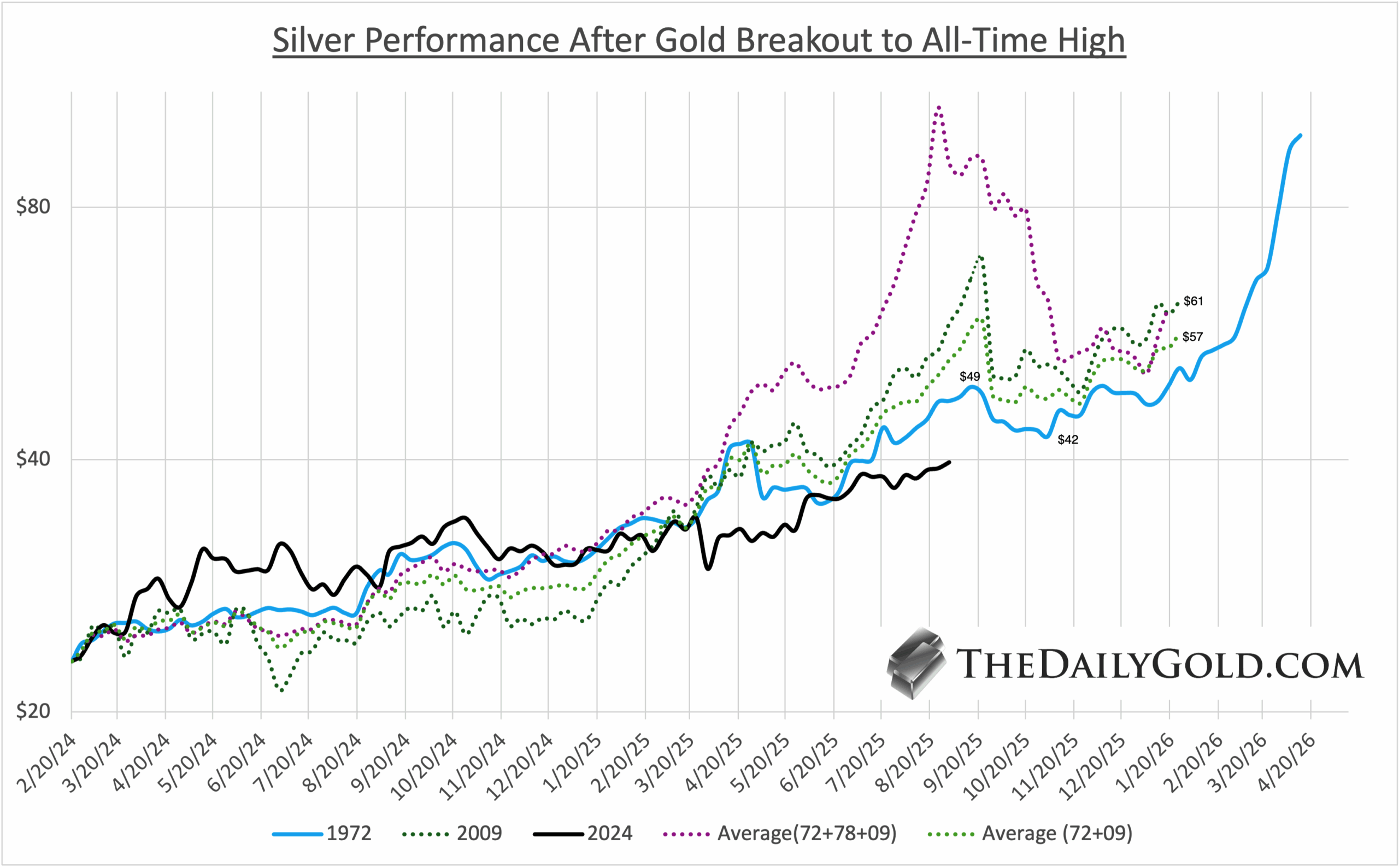 We plot Silver's performance after the Gold Breakouts to new All-Time Highs in 1972, 1978 and 2009.