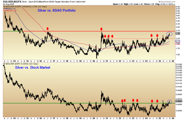 The short-term positives are that Gold has more upside to its target while Silver has made small breakouts against the stock market and 60/40