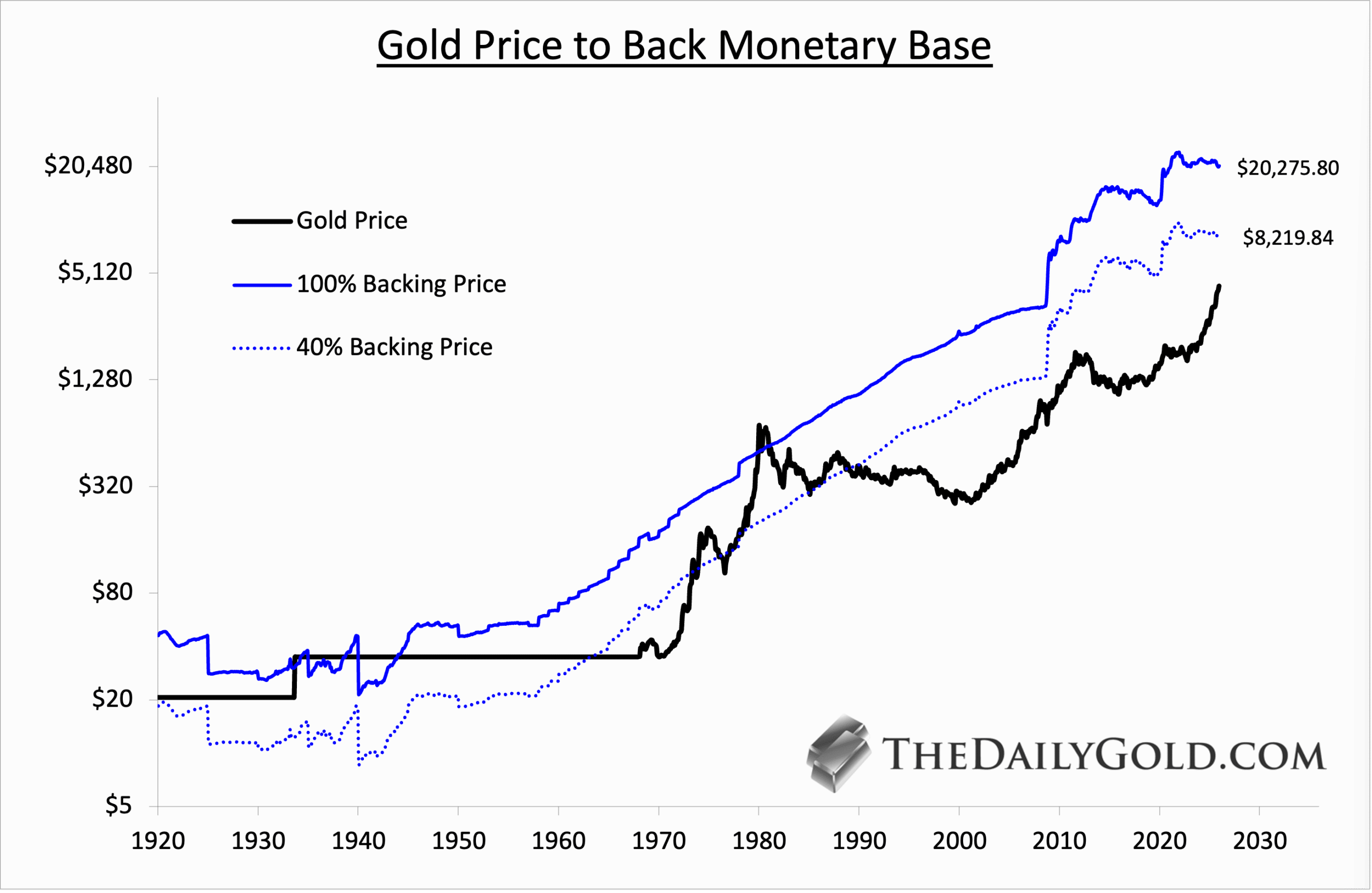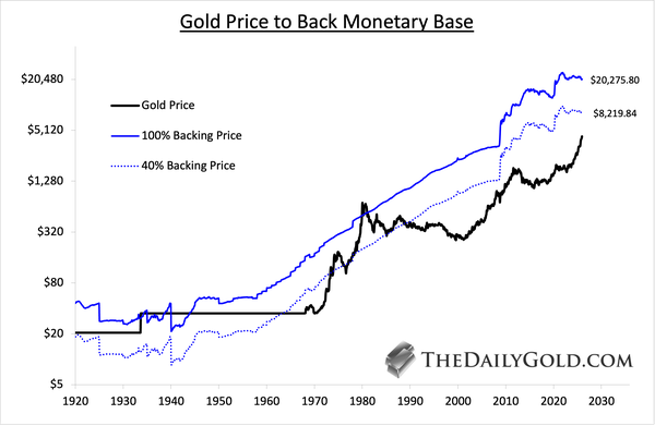 Here we plot the Gold price and then the prices needed to back 40% and 100% of the monetary base.